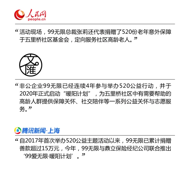 2020年(nián)5月(yuè)20日(rì),99無限和(hé)康橋保險經紀聯合黃(huáng)浦區(qū)$÷五裡(lǐ)橋街(jiē)道(dào)、打浦橋街(jiē)道(dào)舉辦的(de)“99愛(ài××)無限”第四季“惟愛(ài)守護”雲端公益活動,“99愛(ài)無限·暖陽計(jì)劃”作(zuò)為φα(wèi)其中一(yī)個(gè)重要(yào)環節首次公開(kāi), βφ€向五裡(lǐ)橋社區(qū)基金(jīn)會(huì)捐贈520份老(✘♠×lǎo)年(nián)意外(wài)保障險,定向針對(duì)社區(qū)中需要(yào)幫助的(de)高(gāo)齡人(rén)群提δ>π•供保障、社交 、陪伴等一(yī)☆λ系列公益關懷與志(zhì)願服務。
